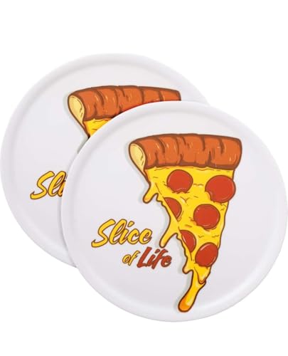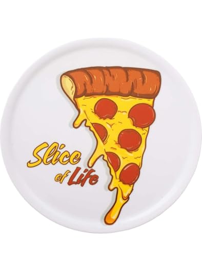 - طقم متكامل: يتضمن صينيتين من البورسلين الأبيض لتقديم البيتزا بتصميم عصري وجذاب مع رسومات ملونة وعبارة "Slice of Life"