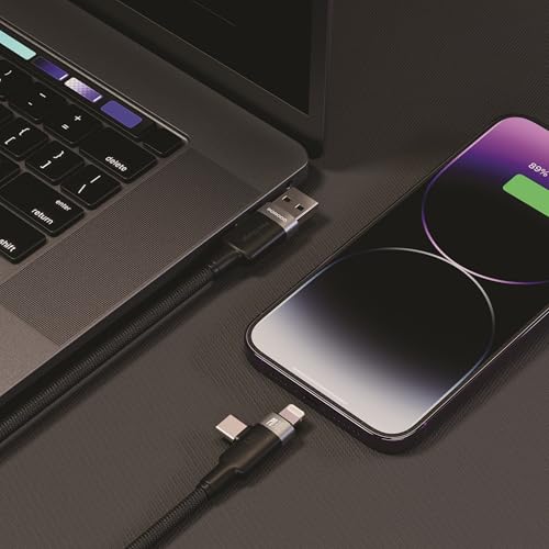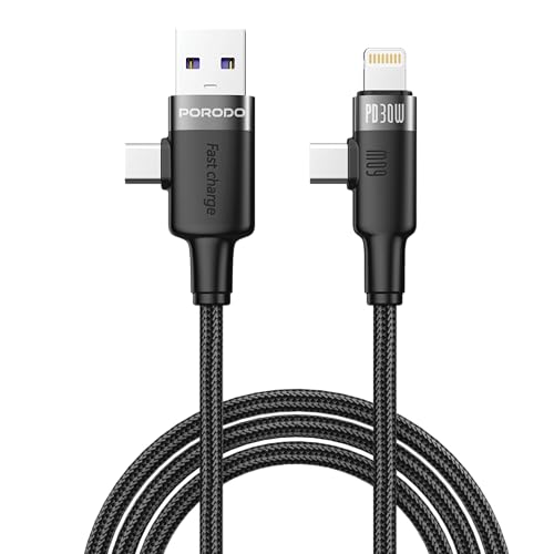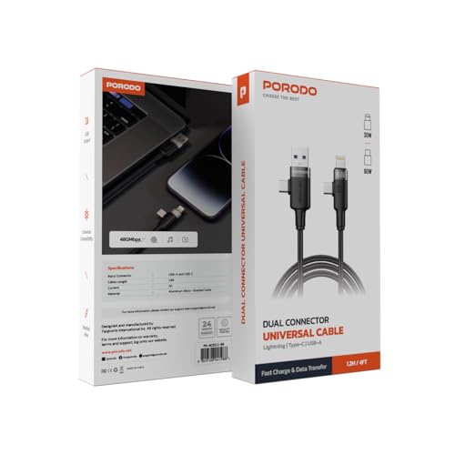 Porodo - بورودو كابل عالمي مزدوج الموصل 60 واط لايتنينج وUSB-C وUSB-A بطول 1.2 متر، شحن سريع ونقل بيانات، مخرج USB-A مضفر، متوافق مع ايفون 16/15/14/13، S25/S24/S23، لاب توب، تابلت، اسود
