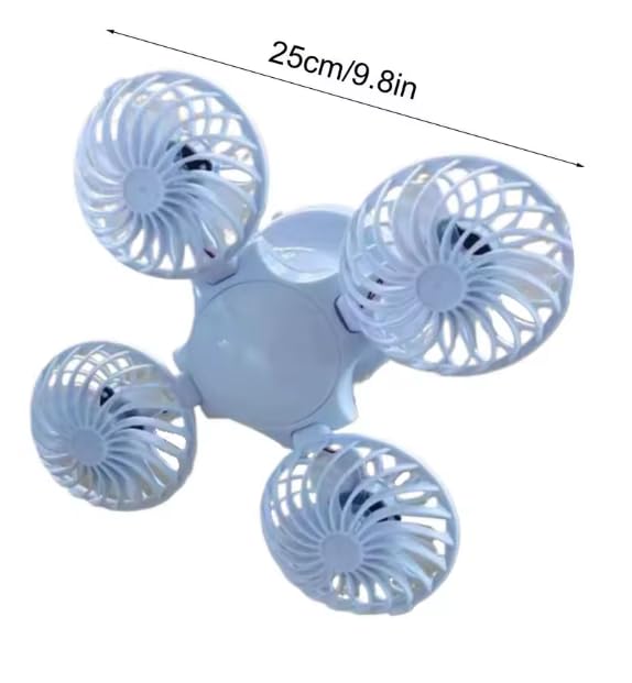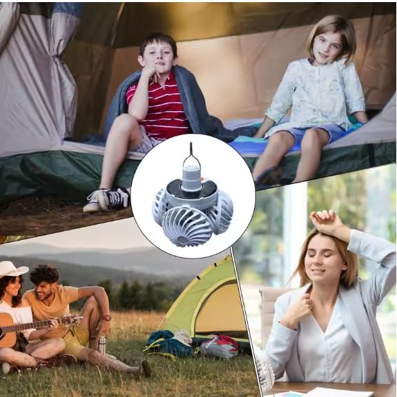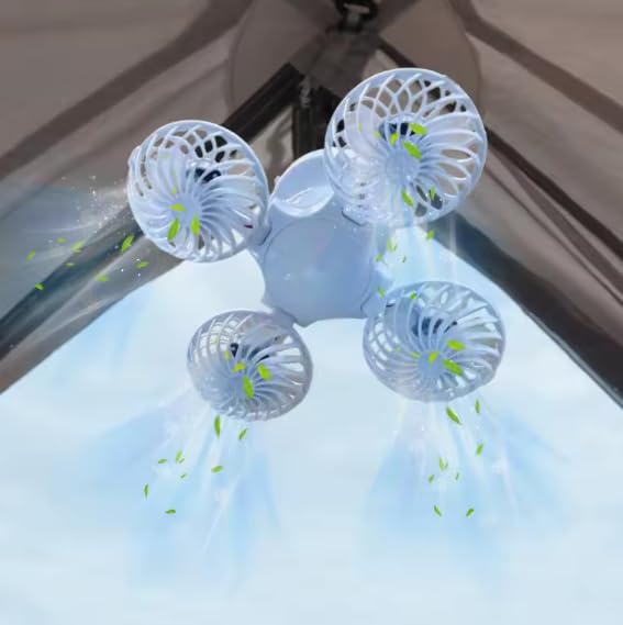Generic - مروحة تخييم محمولة بـ4 رؤوس مع ضوء، قابلة لإعادة الشحن بمنفذ USB، قابلة للتعديل بزاوية 360 درجة، خطاف تعليق للخيام
