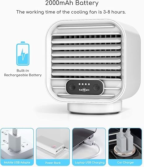 - خزان مياه قابل للإزالة وبطارية 2000 ميلي امبير في الساعة بتصميم خزان مياه قابل للإزالة في الأسفل، مما يجعل مبرد الهواء الشخصي أسهل في ملء الماء. بطارية ليثيوم مدمجة 2000 ميلي امبير في الساعة، مع كابل USB، يمكن توصيلها بالباور بانك والمحول واللاب توب للاستخدام. مريحة للشحن في أي وقت وفي أي مكان.