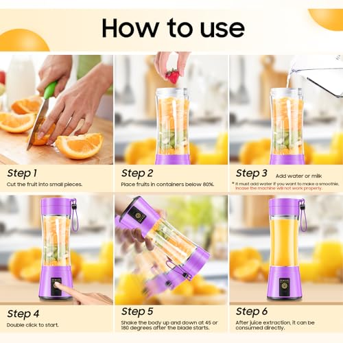 - 【استخدم الخطوات بشكل صحيح】الخطوة 1: قطع الفاكهة إلى قطع صغيرة وأضفها إلى حوالي 80% من الكوب. الخطوة 2: أضف الماء أو الحليب، وإلا فلن يعمل بشكل صحيح. الخطوة 3: اقلب الجهاز رأسًا على عقب حتى تكون الشفرات مكشوفة بالكامل. الخطوة 4: انقر نقرًا مزدوجًا على مفتاح التشغيل. الخطوة 5: أدر الشفرة لمدة 1-2 ثانية، ثم ضع الماكينة في وضع مستقيم وهز الماكينة أثناء العصر.