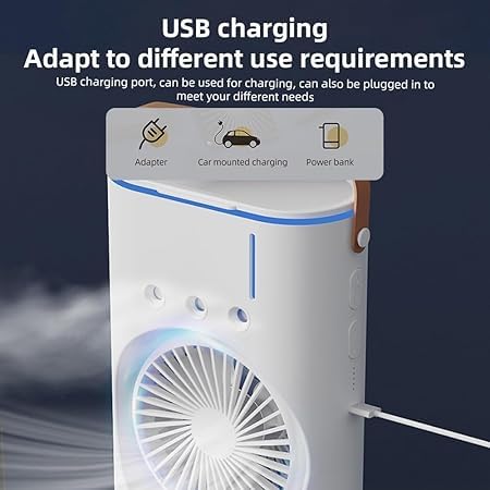 Generic - مبرد رذاذ محمول بمروحة مزدوجة، قابل لاعادة الشحن بمنفذ USB، خزان مياه 280 مل، 7 الوان LED، جهاز تحكم عن بعد، 3 اعدادات للسرعة، ابيض