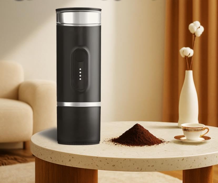 - تصميم محمول وعصري: مطحنة قهوة كهربائية بتصميم أسطواني أنيق باللون الأسود مع تفاصيل فضية، مثالية للاستخدام المنزلي أو أثناء التنقل