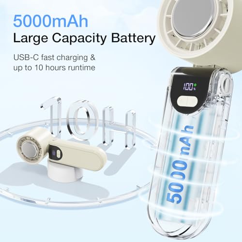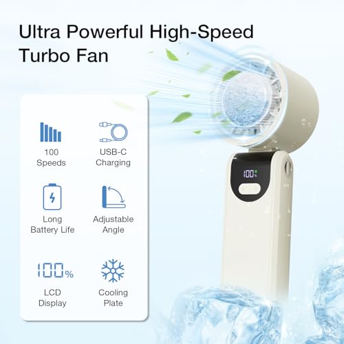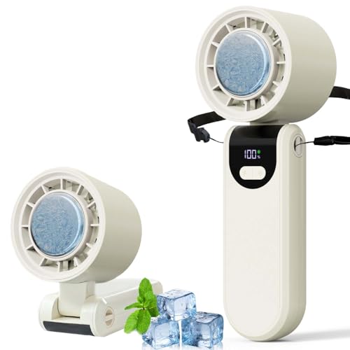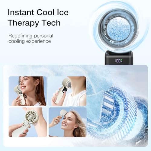 feekaa - مروحة محمولة مع تبريد ثلجي، مروحة يد 5000mAh قابلة لاعادة الشحن مع 100 اعدادات سرعة، مروحة صغيرة 3 في 1 للرقبة والمكتب ومروحة محمولة، مروحة محمولة للسفر في الهواء الطلق والتخييم والمشي لمسافات طويلة