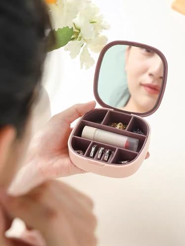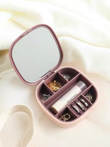Generic - صندوق مجوهرات محمول يدوية أحمر الشفاه تخزين الخواتم الأقراط القلائد صغير مقاوم للغبار مع مرآة وردي بلاستيك