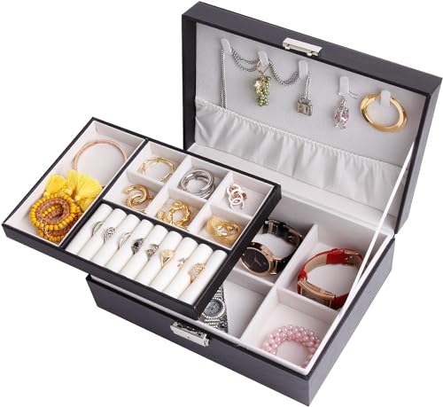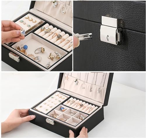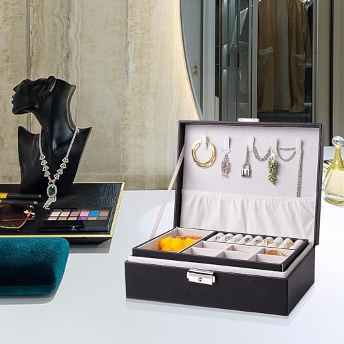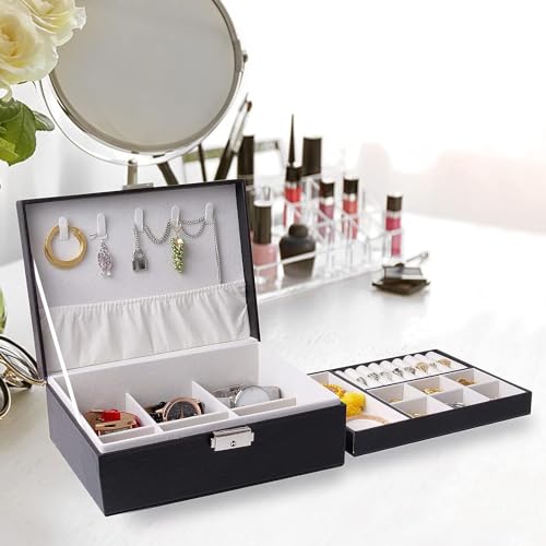 Generic - صندوق مجوهرات قابل للحمل من الجلد الصناعي لتخزين السلاسل والخواتم والساعات والمجوهرات من طابقين ببطانة ناعمة مع قفل، للخواتم والحلقان والسلاسل والأساور، أسود