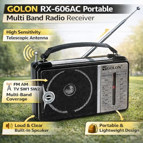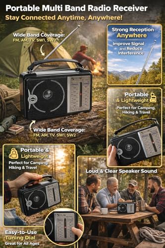 Generic - راديو محمول متعدد النطاقات - مستقبل موجات قصيرة اف ام وايه ام وتي في واس دبليو، اريال راديو عالي الحساسية، مكبر للصوت قوي للمنزل والتخييم والسفر والاستخدام في حالات الطوارئ