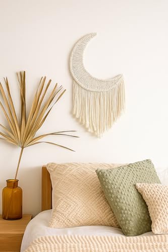 OVA - مكرمية بتصميم بوهيمي على شكل هلال وقمر للتعليق على الحائط مع شراشيب، ديكور قطن بنسيج محبوك يدويا للمنزل وغرفة النوم