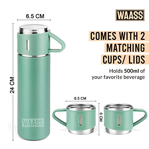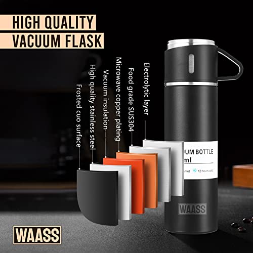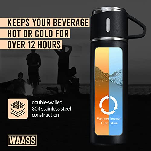 OVA - ترمس حراري معزول مصمم بتقنية التفريغ الهوائي مع غطاء بنمط كوب للقهوة والشاي والمروبات الساخنة والباردة مناسب للسفر والإهداء من واس، مجموعة من ترمس حراري وكوبين (لون أسود)