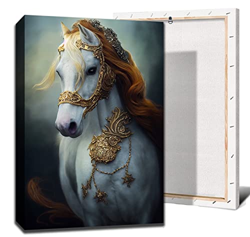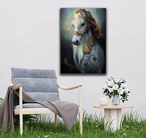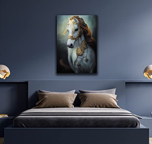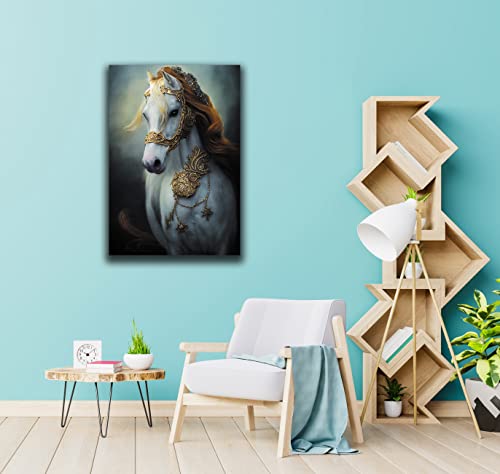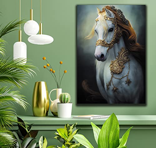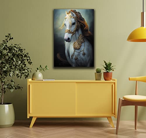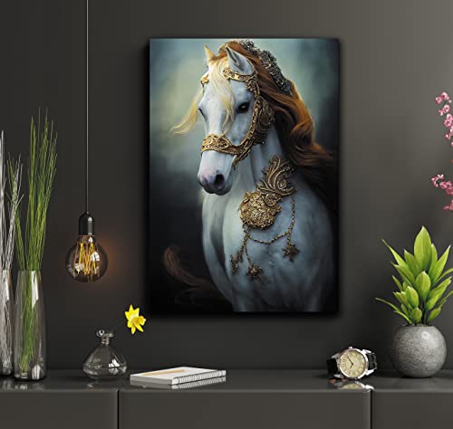 Al Adham - لوحة بورتريه بتصميم حصان جاهزة للتعليق لتزيين الحائط في غرف المعيشة والمكتب والمنزل 40×60 سم، لديكور مكتب وغرفة نوم، أبيض وأسود وذهبي