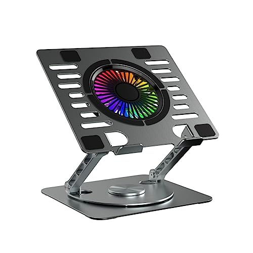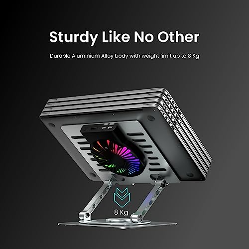 Portronics - حامل لاب توب ماي بادي سبينلايت من بورترونيكس، بمروحة تبريد، وقاعدة دوارة 360 درجة، وارتفاع وزاوية قابلين للتعديل، وإضاءة ار جي بي، وجسم مناسب لأجهزة اللابتوب وأجهزة التابلت حتى 15.6 بوصة (لون فضي)