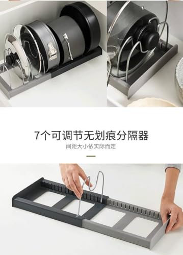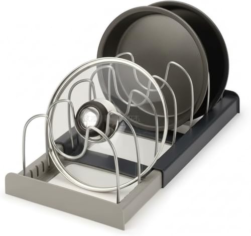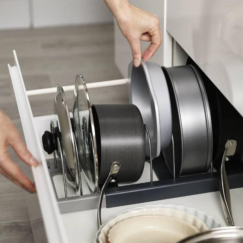 - تنظيم شامل لأغطية الحلة والأدوات: حامل غطاء الحلة يسمح لك بترتيب كل أغطية الحلة، الصواني، وقوالب الكيك بطريقة منظمة، مما يسهل الوصول لأي قطعة بسرعة دون فوضى أو تشابك.