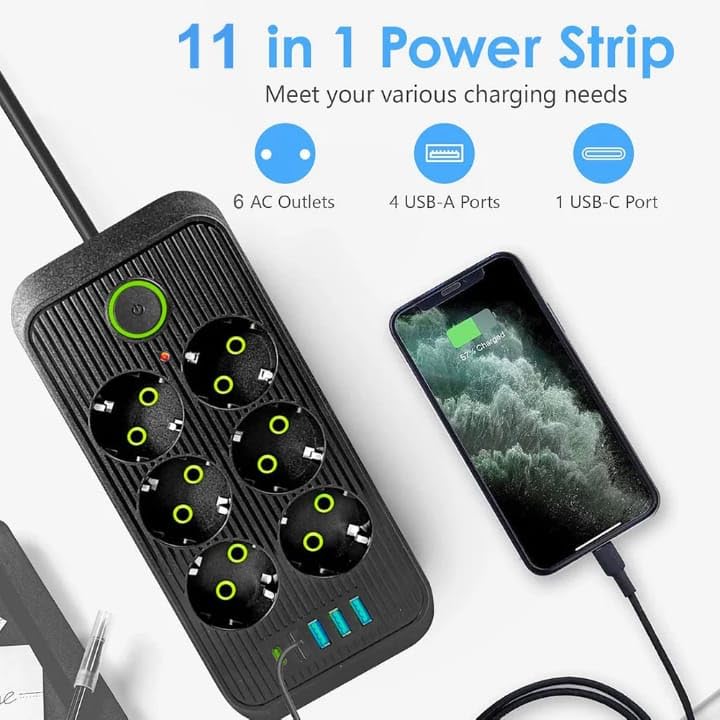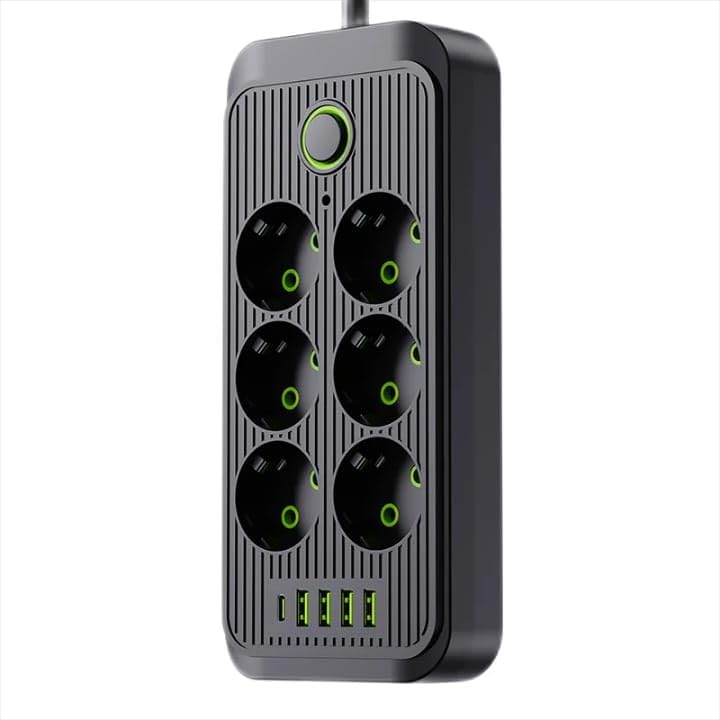 - اشحن جميع أجهزتك في الوقت نفسه وودّع فوضى التوصيلات. بفضل 6 منافذ و4 منافذ USB، يتيح لك مقبس تمديد الطاقة هذا تشغيل الهواتف وأجهزة اللابتوب والتلفزيون وغيرها في آنٍ واحد ومن مكان واحد.