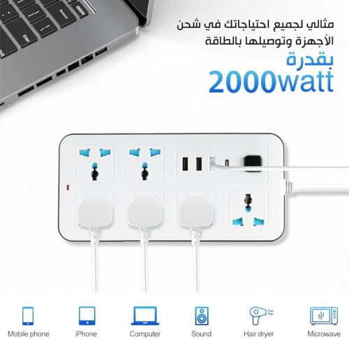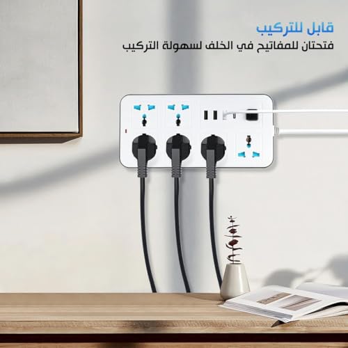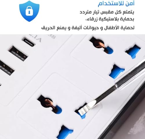 Generic - مقبس تمديد الطاقة مع 3 منافذ USB، 1 نوع سي و6 منافذ تيار متردد بحماية من الحمل الزائد، مزود بمفتاح آمان، آمن على الأطفال مع كابل بطول 2 م