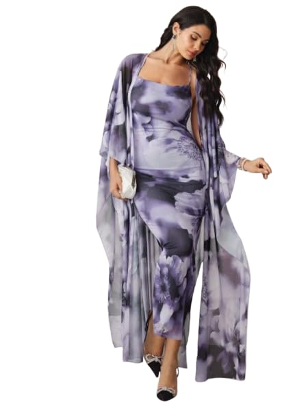 Generic - طقم فستان شيفون باور فري سايز لحد 85 كجم – موديل فاخر بطبعة زهور – كود 2385 – مستورد عالي الجودة