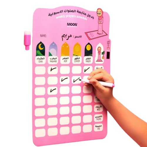 Generic - جدول متابعة الصلاه للاطفال مع قلم ماركر قابل للمسح لاعادة الاستخدام مئات المرات ودابل فيس للتعليق ، ملصقات تعليميه لغرف الاطفال (زهري للفتيات)