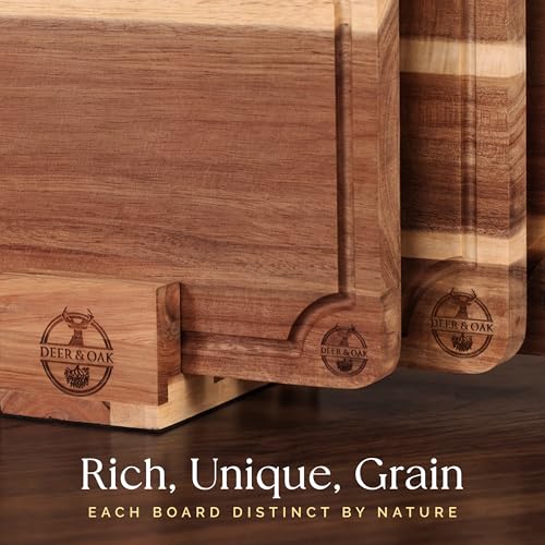 Deer & Oak - مجموعة الواح تقطيع اكاسيا مسبقة التزييت وغير سامة من 3 قطع مع حامل، الواح تقطيع خشبية معتمدة من مجلس رعاية الغزلان والبلوط تتضمن زيت لوح تقطيع 100 مل و3 احجام للمنزل ومطابخ الشواء والغزلان والبلوط