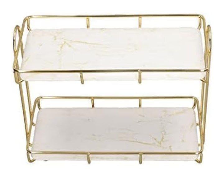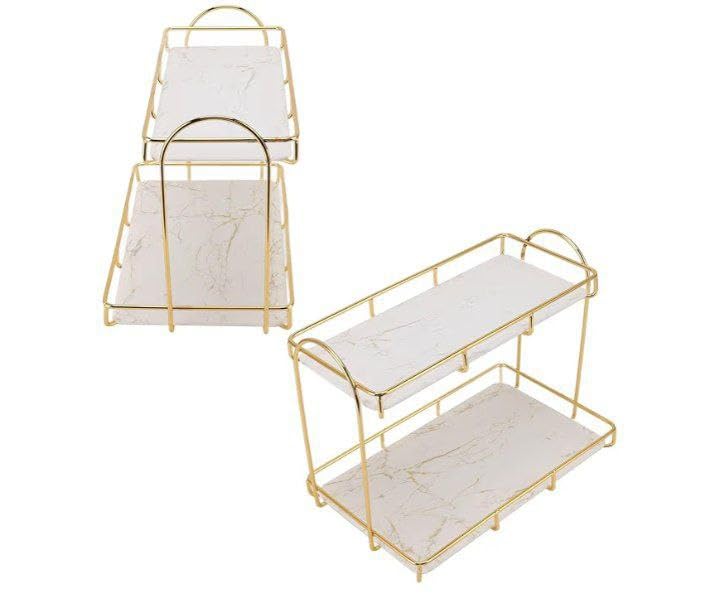 Generic - منظم مكياج معدني ذهبي فاخر بطبقتين - حامل متين مقاوم للصدا مع صينية رخامية لمستحضرات التجميل والعناية بالبشرة والعطور والحمام والمطبخ (ذهبي، قطعتان)