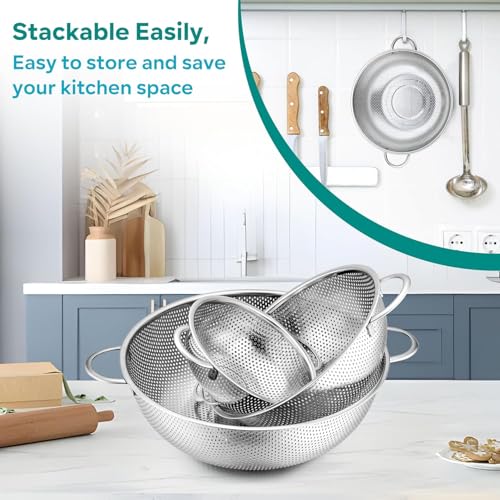 - جودة فولاذ مقاوم للصدأ فاخرة: مصنوعة من الفولاذ المقاوم للصدأ 18/10 عالي الجودة، هذه المصافي مصممة لتدوم طويلاً. تقاوم الصدأ والتآكل والبقع حتى مع الاستخدام اليومي. تحافظ اللمسة النهائية المتينة على لمعانها، مما يضمن أن مطبخك يبدو أنيقًا مع توفير سلامة فائقة للطعام وأداء طويل الأمد.