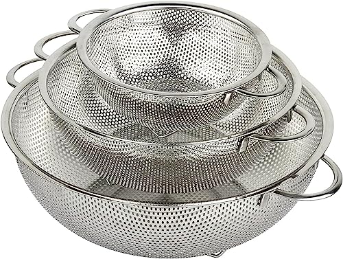 - مقبض مريح وقاعدة ثابتة: تحتوي كل مصفاة على مقبض قوي مقاوم للحرارة لرفع آمن، وقاعدة متينة بأقدام صغيرة للحفاظ على ثباتها على أسطح المناضد. استمتع بتصريف خالي من الفوضى وسهولة المناورة، حتى عند التعامل مع الأطعمة الساخنة أو الثقيلة.