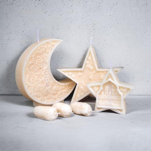 Tablouhaty - مجموعة شموع زينة رمضان ثلاثية الابعاد فاخرة - صورة ظلية للمسجد والقمر والفانوس والنجمة - ديكور شمع بيج دافئ للاحتفالات بالعيد والمنزل