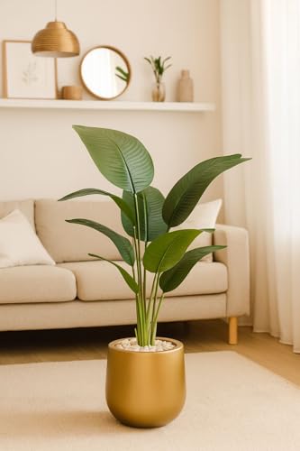 Generic - نبات موز اصطناعي فاخر مع أوراق خضراء كبيرة، وعاء فايبرجلاس ذهبي، ديكور منزلي داخلي