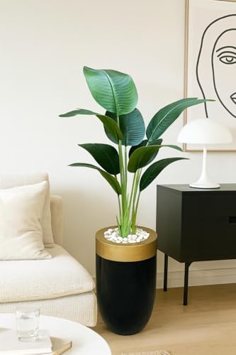 Generic - شجرة موز اصطناعية فاخرة مع أوراق خضراء كبيرة، حوض فايبرجلاس أسود وذهبي للديكور الداخلي