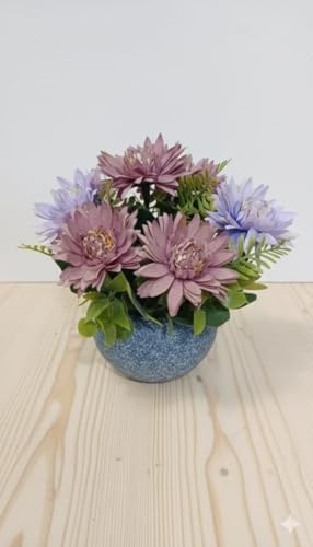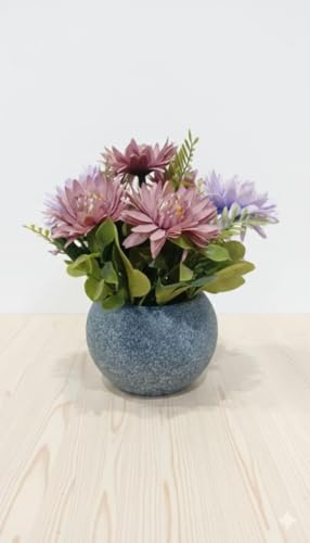 - تصميم عصري: مزهرية حجرية رمادية أنيقة مع زهور بنفسجية وزرقاء اصطناعية، مثالية لتزيين طاولات المنزل والمكتب