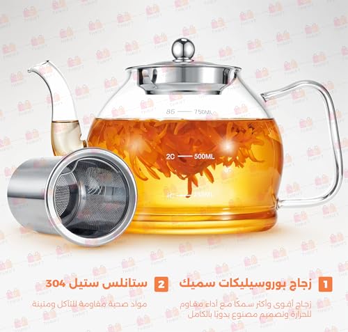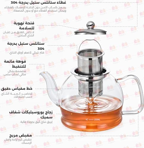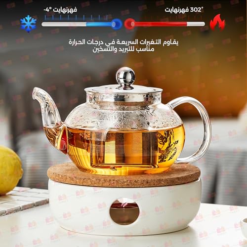 - ☕ زجاج بوروسيليكات فاخر - الإبريق مصنوع من زجاج البورسيليكات الفاخر وهو مقاوم للحرارة (من -20 درجة مئوية إلى 150 درجة مئوية) ومقاوم للخدش وخالي تمامًا من الرصاص، مما يضمن لك الحصول على أنقى نكهة للشاي.
