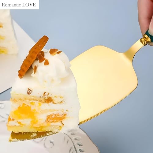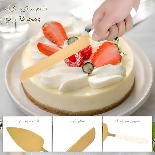 - تتميز مجموعة تقديم الكيك الذهبية الفاخرة بسكين حاد مصمم لتقطيع الكعك والمعجنات وحتى البيتزا بدون مجهود، مما يضمن قطع نظيفة دون أن تتفتت أو فوضى، مما يجعلها لا غنى عنها لتقديم الحلوى الأنيقة.