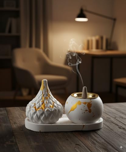 - تصميم فاخر: طقم مبخرة سيراميك بتصميم عصري مميز مع لمسات ذهبية أنيقة على خلفية بيضاء نقية