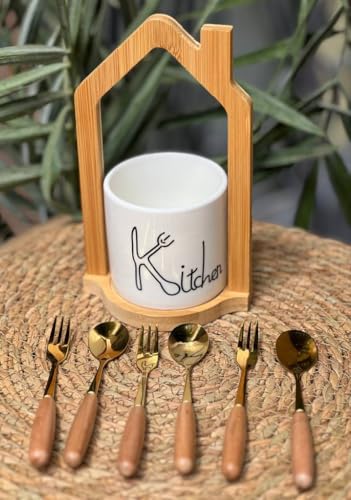 AREXOL - طقم معالق وشوك حلويات فاخر 6 قطع مع قاعدة بورسلين وحامل خشبي طبيعي لتقديم الحلويات والفواكه والضيافة بطريقة أنيقة وعملية يومية
