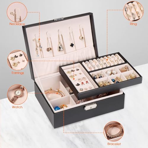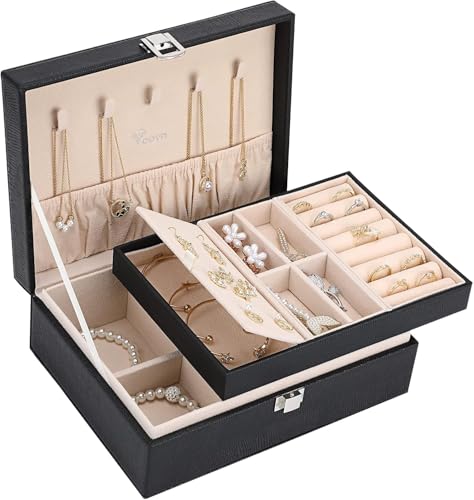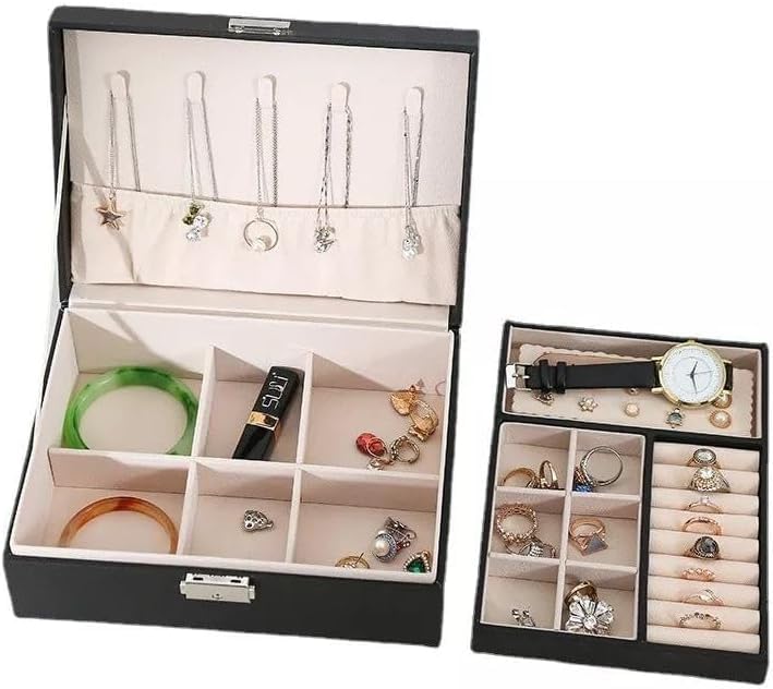 AREXOL - صندوق مجوهرات جلدي فاخر مزدوج الطبقات مع قفل مفتاح 23 سم منظم انيق للخواتم والقلائد والاساور والاقراط للتخزين الامن للمنزل والسفر