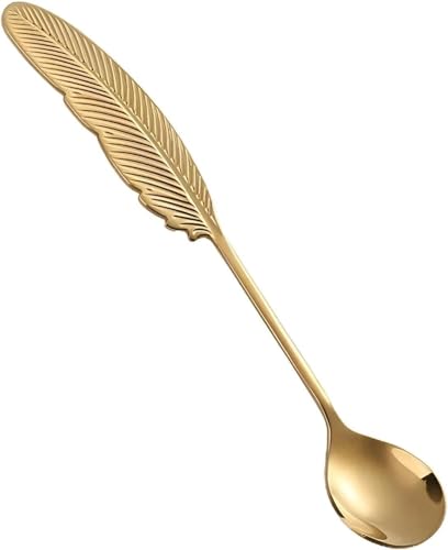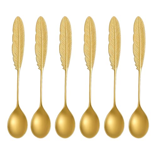 Generic - طقم معالق حلويات ذهبية معدنية أنيقة على شكل ريش للقهوة والحلويات، 6 معالق