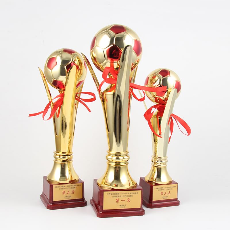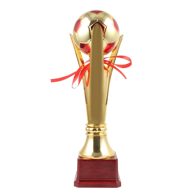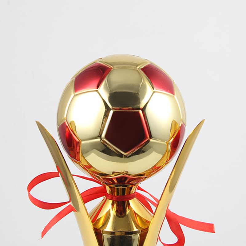 - تفاصيل دقيقة: يتضمن شريط أحمر زخرفي وتصميم كرة قدم واقعي بألوان ذهبية وحمراء، مع عمود أنيق يربط الكأس بالقاعدة