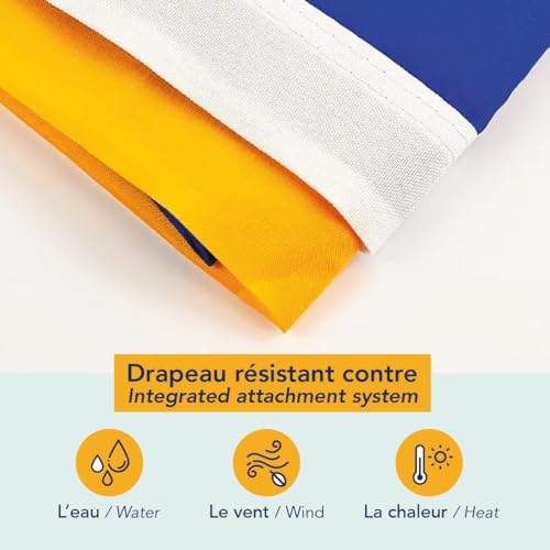 - جميع الأعلام الخاصة بنا ذات جودة عالية جدًا، مصنوعة من البوليستر 100D، وتتميز بلمسة نهائية بخياطة مزدوجة وحواف معززة ومجهزة بفتحات معدنية. يمكن استخدامها في الداخل والخارج.