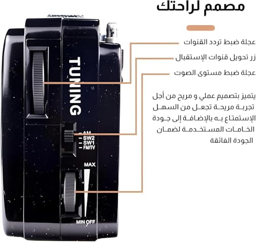 - ✅ 【وصول واسع النطاق متعدد الموجات】 استمتع بـتنوع لا مثيل له مع دعم موجات (AM, FM, SW, TV)، مما يمنحك وصولاً إلى جميع المحطات الرئيسية بوضوح عالٍ، ويسمح بـالاستمتاع المستمر بـتلاوات القرآن الكريم المفضلة لديك أو برامجك دون فقدان استقرار الإشارة في أي مكان. 📻