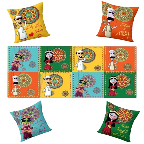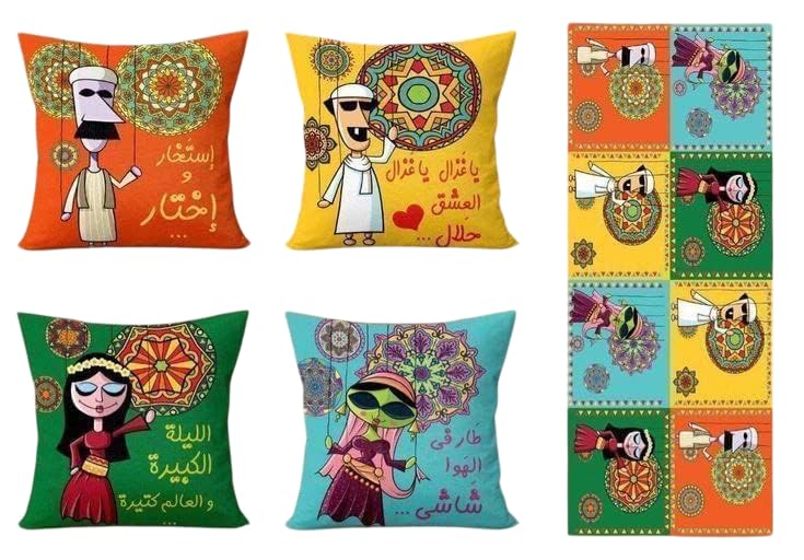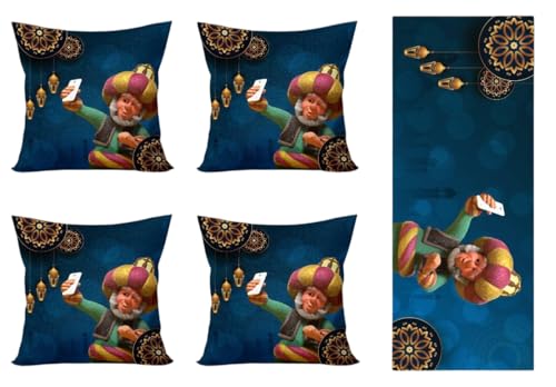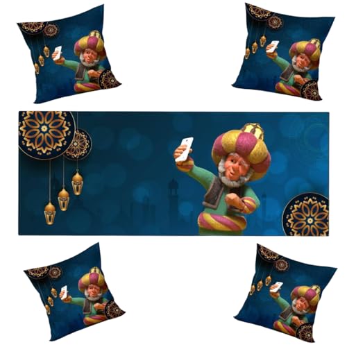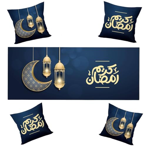 LC - طقم كيس مخدة ومفرش رمضان فاخر يتضمن 4 أكياس مخدات مقاس 40 × 40 سم ومفرش واحد مقاس 1.45 متر × 55 سم، تصميمات رمضان بنمط شرقي مطبوعة على الوجهين، خامة ناعمة وسهلة التنظيف، مثالية لديكور رمضان