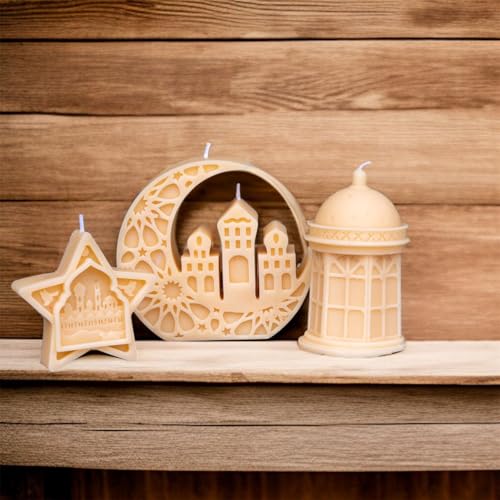 Tablouhaty - مجموعة شموع زينة رمضان فاخرة - هلال مع صورة ظلية للمسجد والفانوس والنجوم - ديكور شمع بيج دافئ للاحتفالات بالعيد والمنزل