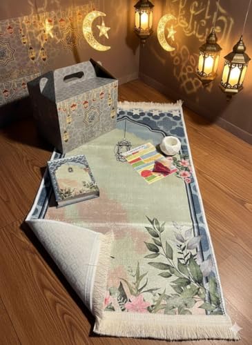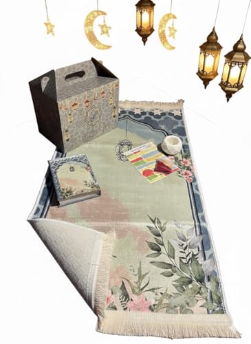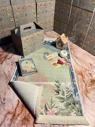 Generic - بوكس هدايا رمضاني فاخر من قماش القطيفة باللون الأخضر – مكتوب عليه تهادوا تحابوا – يحتوي على سجادة صلاة ومبخرة ومصحف وأذكار وبخور