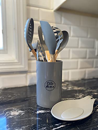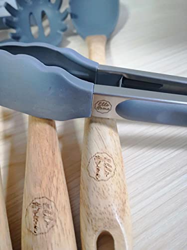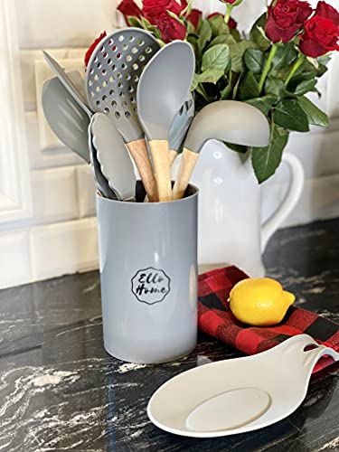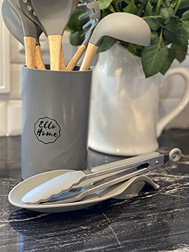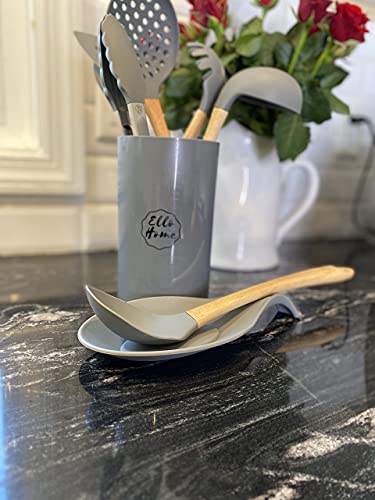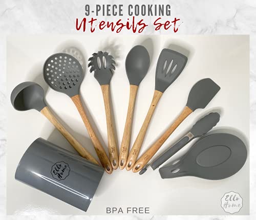 ELLO HOME - طقم توزيع سيليكون فاخر مكون من 9 قطع بلون رمادي مقاومة للحرارة بدرجة 446 درجة فهرنهايت بمقابض خشب مصقول، ادوات طبخ امنة وغير سامة ومقاومة للالتصاق مع حامل، ادوات تقديم بنمط بسيط