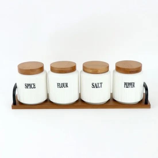 - تحتوي المجموعة على أربعة برطمانات بورسلين مصنوعة بشكل جميل مع حامل خشبي، مما يوفر مظهرًا متناسقًا يعزز ديكور مطبخك ويبسط الوصول إلى التوابل أثناء الطهي.