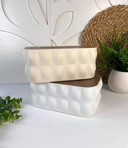 Generic - مجموعة علب مناديل فاخرة - هيكل بلاستيكي فائق المتانة مع جزء علوي خشبي، مظهر متطور لمساحات المعيشة العصرية (ابيض)