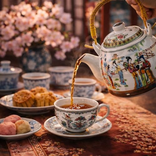 - 1️⃣ تصميم تقليدي أصيل 🎎 إبريق شاي سيراميك جذاب مستوحى من الفن الصيني الكلاسيكي، يتميز برسومات طبيعية تفصيلية ملونة تضفي رقيًا على طريقة تقديم الشاي وتزيين الطاولة.