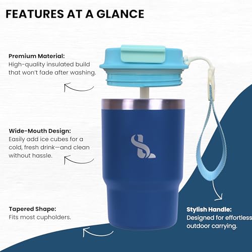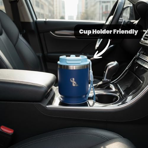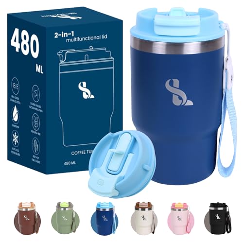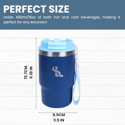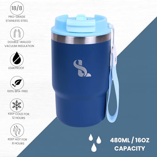 SimplyLivin. - كوب معزول مزدوج الجدار من الفولاذ المقاوم للصدأ بغطاء وشفاطة، تصميم مقاوم للتسرب للقهوة للاستخدام في السفر، كوب للمشروبات الباردة والساخنة، سعة 480 مل، لون أزرق غامق (Midnight Blue)