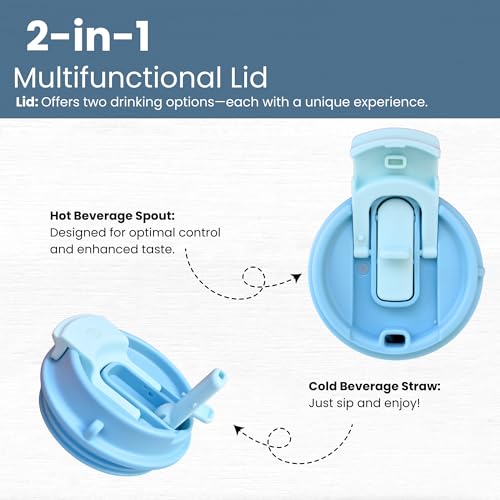 - غطاء متعدد الوظائف: يوفر الغطاء خيارين للشرب - فوهة للمشروبات الساخنة والقشة للمشروبات الباردة، مما يزيد من التحكم والمتعة.