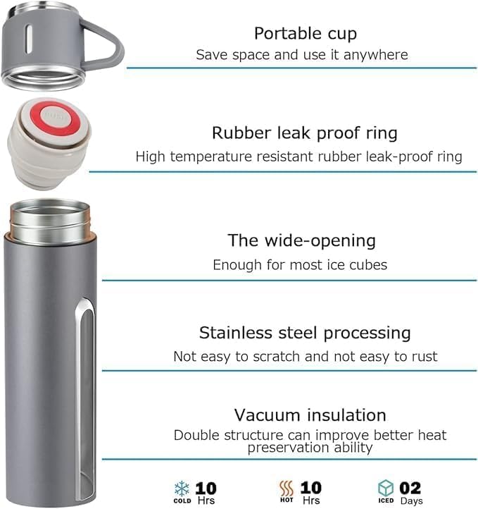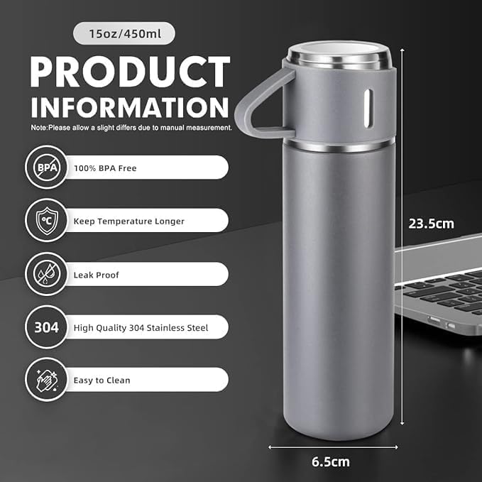 Generic - ترمس حراري ومج سفر من الفولاذ المقاوم للصدأ مع 3 أكواب زجاجة معزولة مانعة للتسرب للمشروبات الساخنة والباردة بلون أسود 500 مل (لون رمادي)