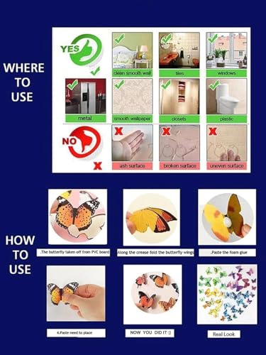 - سهولة التركيب والاستخدام المتعدد: لا تحتاجين إلى أدوات معقدة أو مهارات خاصة. يمكنك تثبيت هذه الفراشات بسهولة على معظم الأسطح النظيفة (الجدران، الزجاج، الخشب) باستخدام المواد اللاصقة المناسبة (غير مدرجة). مثالية لديكور المنزل الدائم، تزيين حفلات الزفاف وأعياد الميلاد، تجميل غرف الأطفال، أو حتى كخلفية خلابة ومميزة لالتقاط الصور الفوتوغرافية.