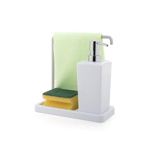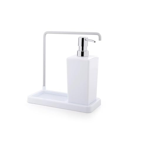 Primanova - موزع صابون المطبخ اكريليك 3 في 1 مع حامل اسفنجة ورف مجفف وزجاجة مضخة وحامل اسفنجة ورف منشفة لحوض المطبخ والتخزين والتنظيم- لون ابيض