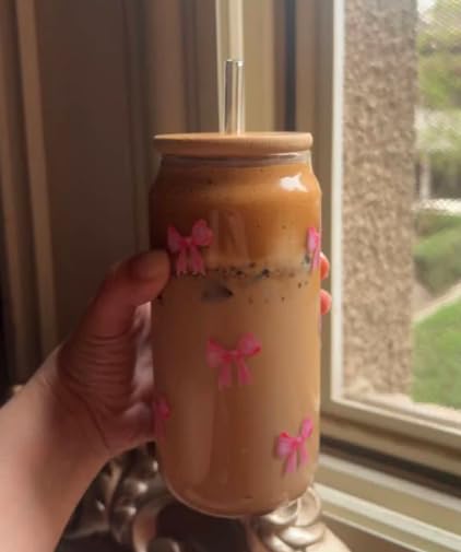 - تصميم ساحر: يتميز بهيكل زجاجي مطبوع شفاف مزين بأنماط فيونكة وردية رقيقة، مما يضيف لمسة أنثوية وأنيقة إلى روتين مشروبك اليومي